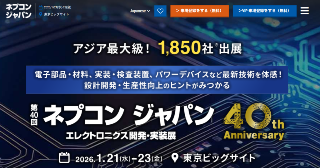 エレクトロニクス開発・実装・製造に関するアジア最大級の展示会「ネプコンジャパン2026」に出展いたします。最新の技術紹介や製品展示を通じて、皆さまの課題解決に貢献できるソリューションをご提案します。